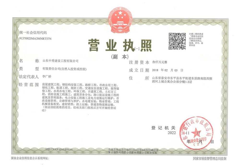 山東中秀建設(shè)工程有限公司成位于山東省泰安市東平縣東平街道東原路南段東側(cè)清河上城,公司主要經(jīng)營(yíng)房屋建筑工程、鋼結(jié)構(gòu)安裝工程、路橋工程、市政公用工程、綠化工程、航道工程、堤防工程、交通安全設(shè)施工程、裝飾裝修工程、水利水電工程、環(huán)保工程、古建筑工程、土石方工程、消防設(shè)施工程施工;建筑勞務(wù)分包;港口航運(yùn)設(shè)施工程的建筑及管理服務(wù);電力安裝工程施工及電力設(shè)施運(yùn)行維護(hù);市政設(shè)施管理、公路管理與養(yǎng)護(hù);水電暖安裝;物業(yè)管理;工程機(jī)械設(shè)備租賃;建材銷(xiāo)售;渣土運(yùn)輸;普通貨物道路運(yùn)輸。擁有建筑工程施工總承包叁級(jí)、市政公用工程總承包叁級(jí)、水利水電工程施工總承包叁級(jí)、環(huán)保工程專(zhuān)業(yè)承包叁級(jí)、鋼結(jié)構(gòu)工程專(zhuān)業(yè)承包叁級(jí)、施工勞務(wù)不分等級(jí)、消防設(shè)施工程專(zhuān)業(yè)承包貳級(jí)、防水防腐保溫工程專(zhuān)業(yè)承包二級(jí)等多項(xiàng)資質(zhì)及普通貨物道路運(yùn)輸許可。